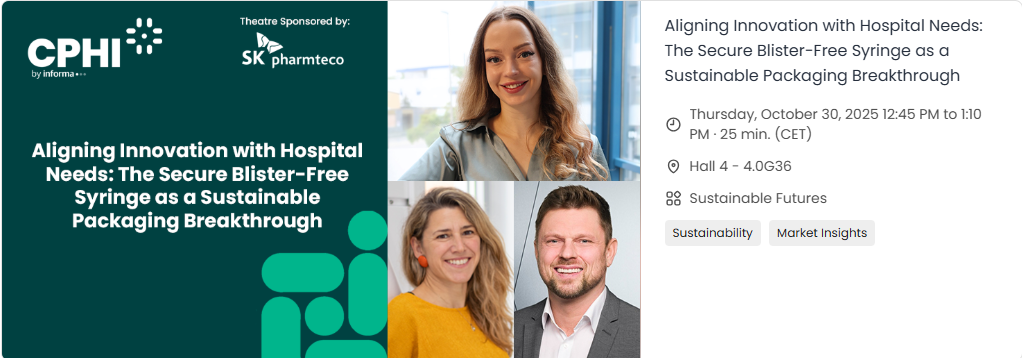 Join Lidia Smith, Nadine Lampka and Christoph Zauner in Hall 4 on Thursday October 30th at 12:45PM as they introduce the Secure Blister-Free Syringe solution, which is a finalist in the sustainability category of the CPhI Awards this year!